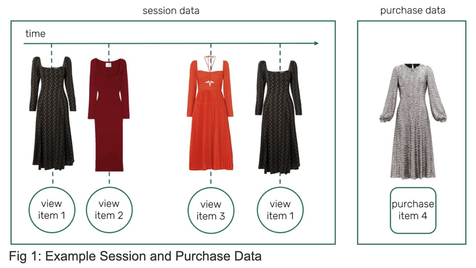 The dataset contains 18 months of online fashion sessions (Jan 2020–Jun 2021), with ~1.1M sessions and ~24k items. Each session includes views and a purchase, with timestamps and sparse item attributes.